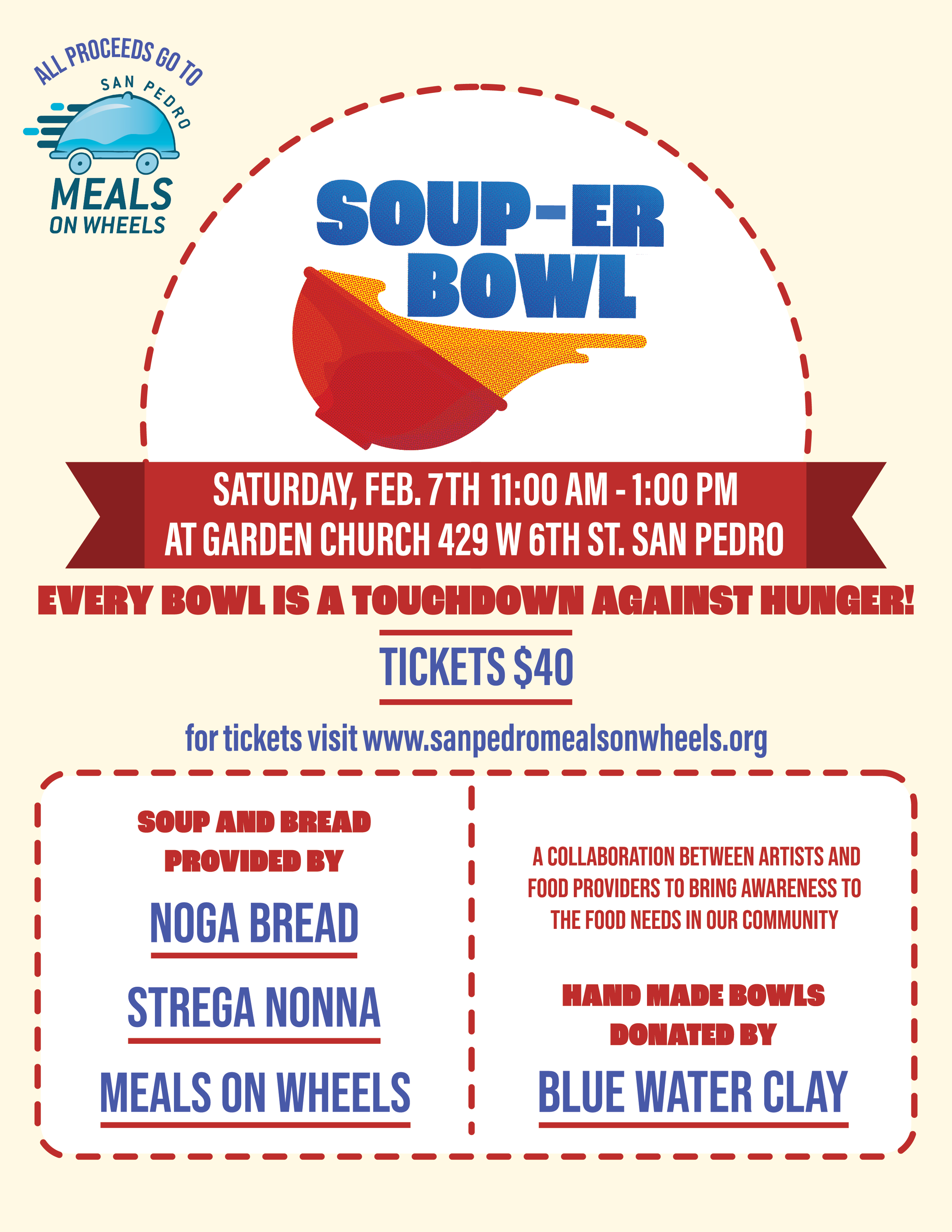 Artists from Blue Water Clay donate handcrafted bowls. On event day attendees receive a bowl filled with soups from local chefs and restaurants, including Strega Nonna, Noga Bread, and Meals on Wheels volunteers. The Garden Church donates the space. We share a meal and learn about local food needs. Proceeds benefit San Pedro Meals on Wheels.